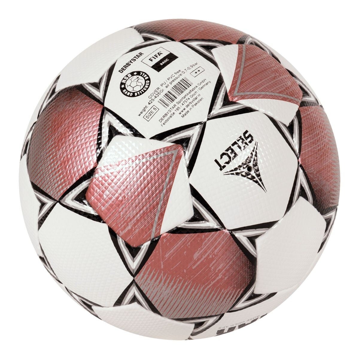 De Derbystar Prof Gold III is een hoogwaardige wedstrijdbal met het FIFA Basic keurmerk. Doordat hij handgestikt is en beschikt over slijtvaste naden, is de bal extra flexibel. De bal is vervaardigd uit duurzaam PU-materiaal, dat aanvoelt als leer, maar niet de nadelen heeft van leer. Op het volledige materiaaloppervlak zit een 3D-diamondstructuur, wat zorgt voor uitstekende, stabiele vluchteigenschappen.